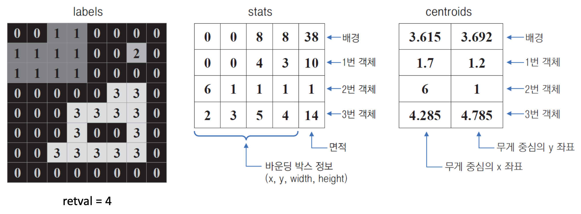 기본값은 cv2.CV_32S. - retval : 객체 개수. N을 반환하면 [0, N-1]의 레이블이 존재하며, 0은 배경을 의미.