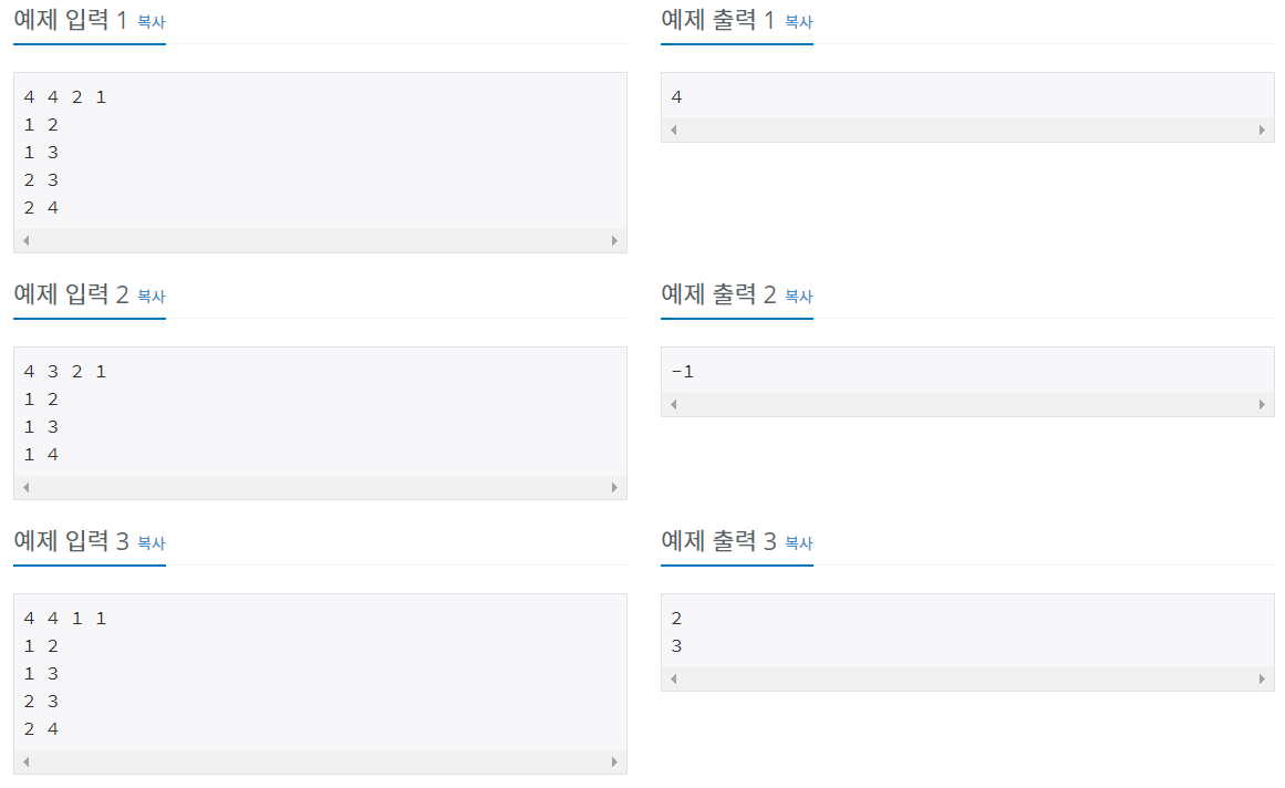 첫째 줄에 도시의 개수 N, 도로의 개수 M, 거리 정보 K, 출발 도시의 번호 X가 주어진다. (2 ≤ N ≤ 300,000, 1 ≤ M ≤ 1,000,000, 1 ≤ K ≤ 300,000, 1 ≤ X ≤ N) 둘째 줄부터 M개의 줄에 걸쳐서 두 개