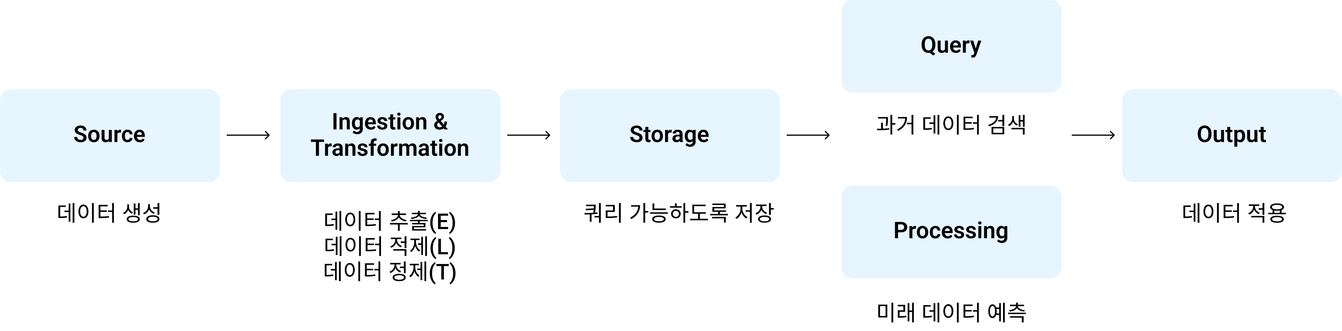 | Query & Processing | 데이터 분석을 위한 인사이트 만들기 (Query) 저장된 데이터를 이용해 쿼리를 실행하고 필요시 분산처리 (Processing) 과거에 무슨 일이 일어났는지 혹은 미래에 무슨일이 일어날지 (ML) |