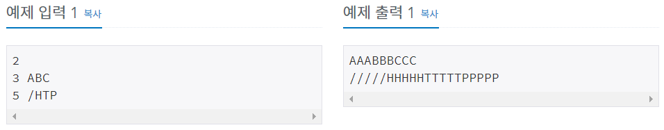 문자열 S를 입력받은 후에, 각 문자를 R번 반복해 새 문자열 P를 만든 후 출력하는 프로그램을 작성하시오.
