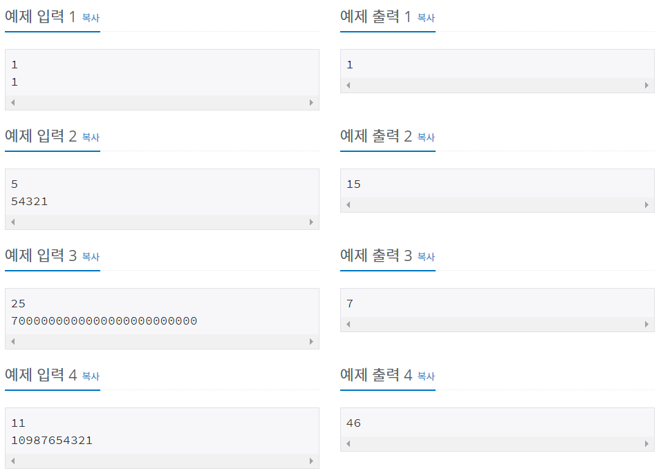 N개의 숫자가 공백 없이 쓰여있다. 이 숫자를 모두 합해서 출력하는 프로그램을 작성하시오.