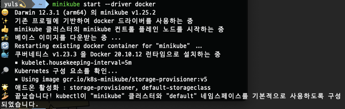docker 드라이버를 이용하여 minikube로 쿠버네티스 클러스터를 구성한다.