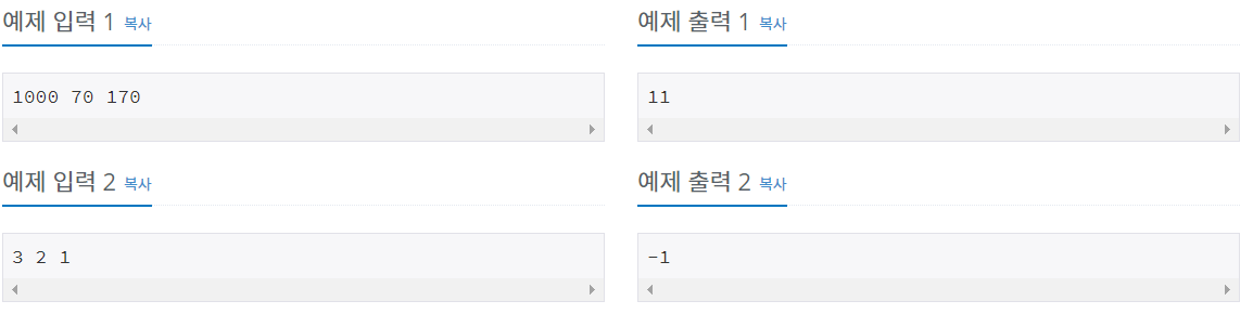 첫 번째 줄에 손익분기점 즉 최초로 이익이 발생하는 판매량을 출력한다. 손익분기점이 존재하지 않으면 -1을 출력한다.